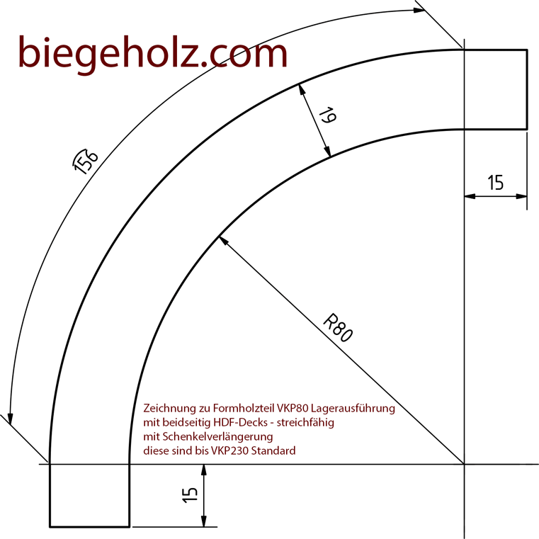 Diese schichtverleimten Formholzprofile sind in der Ausführung HDF (High Density Fiberboard) in streichfähiger Oberfläche in den Längen 1.495 & 3.000 mm lagernd verfügbar.Eine 15 mm Schenkelverlängerung wir standardmäßig bei den Innenradien von 40 – 230 mm gefertigt. Ab einen Innenradius von 280 mm erfolgt keine Schenkelverlängerung standardmäßig.